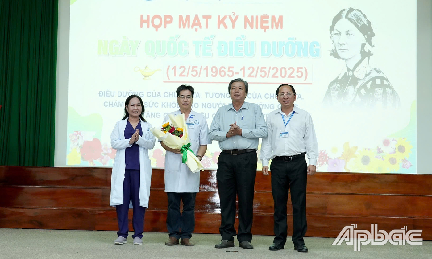 ThS.CK2 Trịnh Xuân Quang, Trưởng Phòng Điều dưỡng đại diện cho gần 700 điều dưỡng của BVĐK tỉnh Tiền Giang nhận hoa chúc mừng từ Ban Giám đốc bệnh viện.